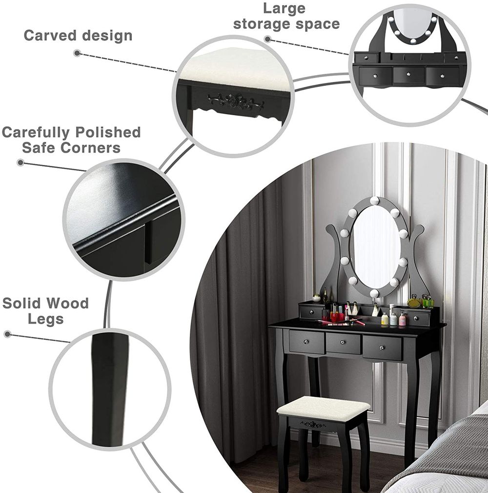 5 Drawer LED Hollywood Black Vanity Makeup Dressing Table Set